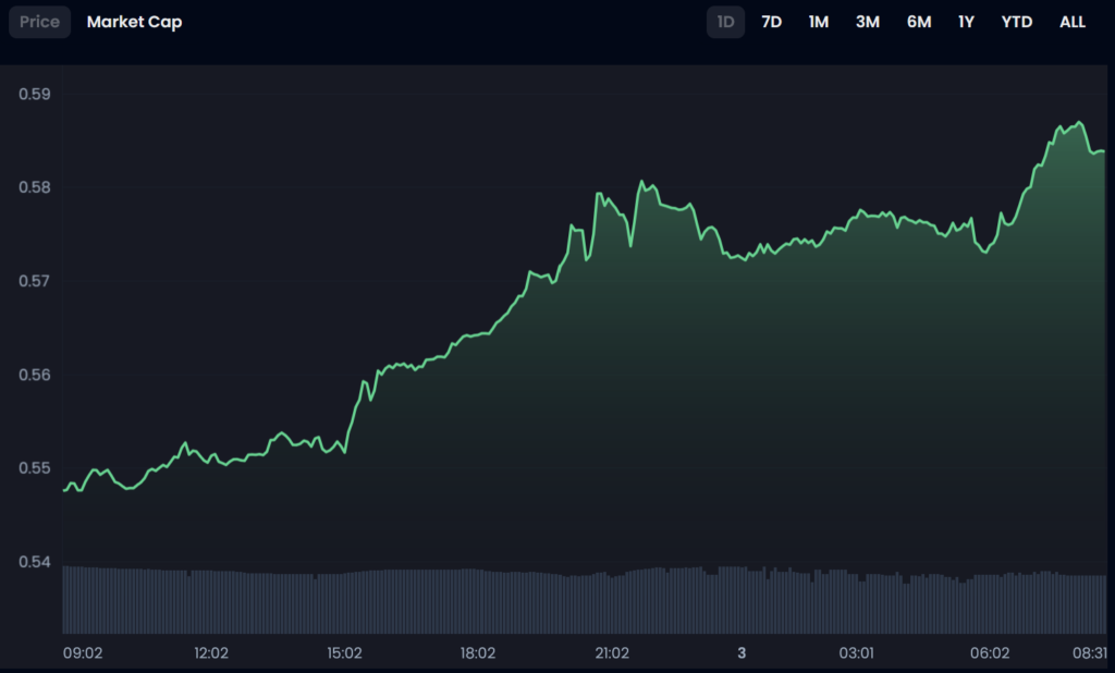 In the past 24 hours the spot price of the Barcelona Fan Token ($BAR) rose 7%, as the token price climbed from $0.547 up to $0.586.