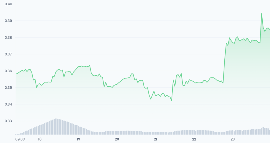 Zooming out, the token has gained 11.12% over the past seven days, and the weekly chart reflects that narrative. For most of the week, AFC hovered in the $0.35–$0.36 range with mild intraday fluctuations. Then, as the weekend approached — just ahead of the Tottenham clash — a decisive breakout pushed the Fan Token above $0.38, followed by another spike nearing $0.40, perfectly aligning with the reported 24-hour rally.