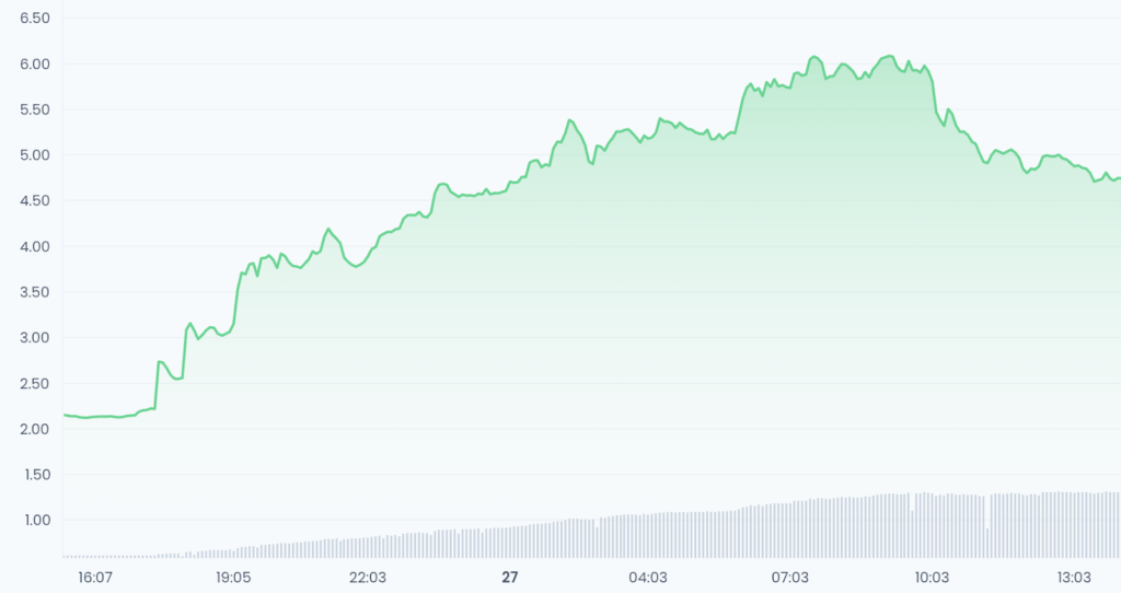 In stark contrast to Alpine’s miserable track record, the Alpine F1 Team Fan Token (ALPINE) has produced a performance that shocked the market. Currently valued at $5.16, the token jumped 141.19% in the last 24 hours and recorded an even greater 159.05% surge over the past week.