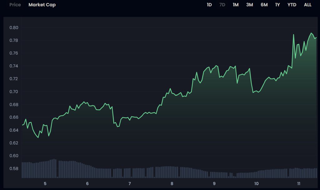From last week’s starting point of $0.628, the Argentine Football Association Fan Token ($ARG) rose 25% over seven days, climbing to a valuation of $0.791 recorded on Nov. 11.