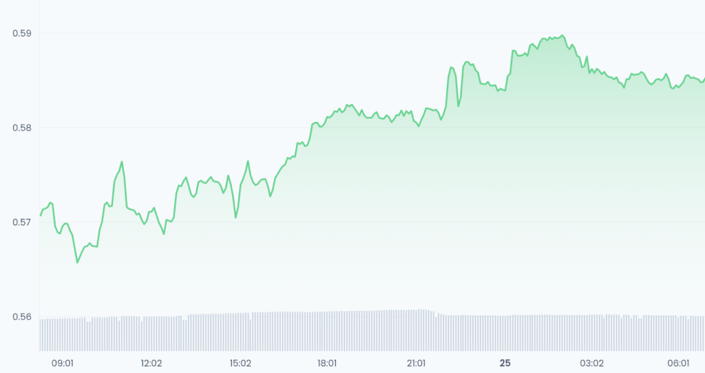 The FC Barcelona Fan Token is priced at $0.5856 today, reflecting a 2.11% increase in the last 24 hours despite logging a 0.84% dip over the past week.