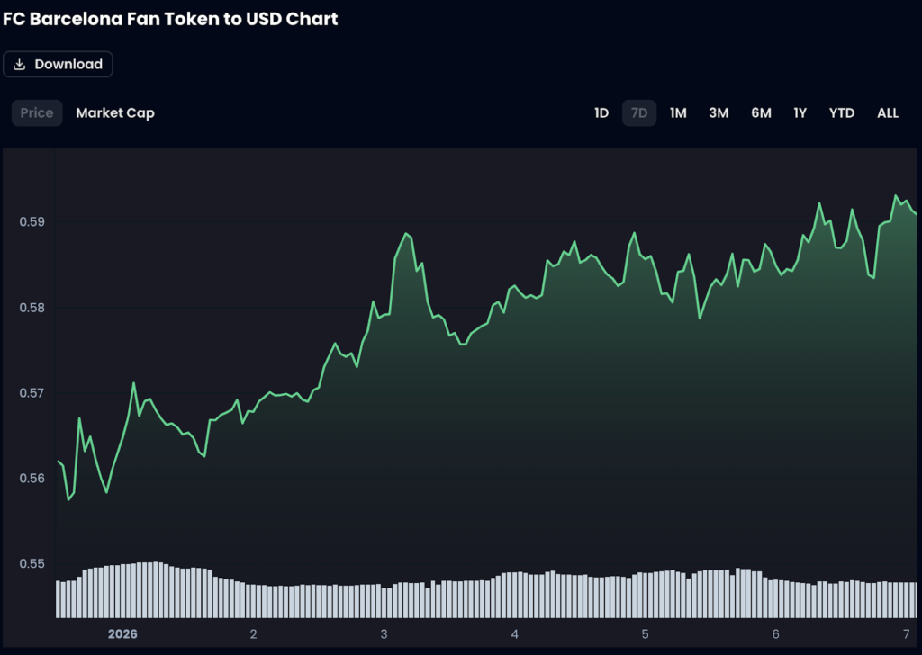 Although we are just one week and one game into 2026, and Barça left it late to see off Espanyol through goals from Dani Olmo and Robert Lewandowski, the Barcelona Fan Token ($BAR) has enjoyed an impressive 10.2% rise in value over the last seven days.