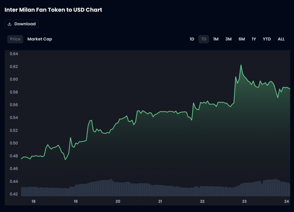 $INTER trading has largely tracked sideways on matchday, although 24hr volumes have consistently been north of $5 million. The token’s value, meanwhile, has dropped by 3.8% in the last 24 hours.