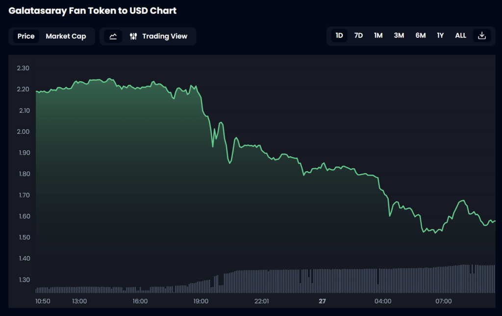 The valuation of the Galatasaray Fan Token™ ($GAL) dropped by 29.1% in the 24-hour period leading up to April 27 as per price data from Socios.com, the day after Galatasaray beat Fenerbahce 3-0 in the Turkish Süper Lig.