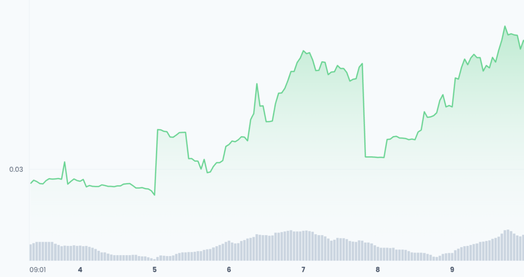 A brief dip occurred early on the eighth day, visible as a sharp downward step on the chart, but the token recovered quickly and continued its upward track. The move into the $0.034 to $0.035 region toward the end of the chart aligns with the current market price and confirms that buyers are maintaining control.