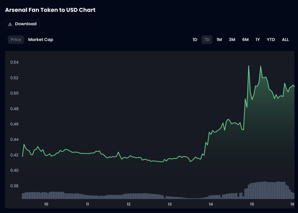 Arsenal’s 2-0 win over Everton, coupled with Manchester City’s 1-1 draw with West Ham, was reflected in the market as the value of the Arsenal Fan Token ($AFC) rocketed 13.6% between March 14 and 16, while $CITY fell 1.7% over the same period, per Socios.com.