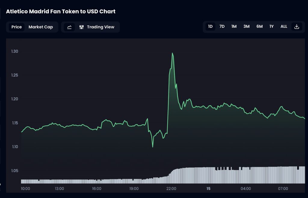 Unsurprisingly, the two quick-fire goals turned Barcelona Fan Token ($BAR) sentiment positive: its spot price quickly rose from $0.551 prematch to $0.579, a jump of 5%. By the same token, the Atlético Madrid Fan Token ($ATM) shed 5.1%.