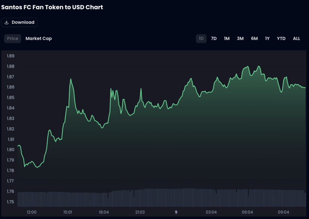 In the last 48 hours, the value of the Santos FC Fan Token ($SANTOS) has risen from $1.74 to $1.86, a jump of 6.8%, as the market reacts to the news. Trade volume has also been especially strong, rising from $4.3 million to $6.8 million at the time of writing. $SANTOS is the most valuable Fan Token by market cap, with a total market value of $29.9 million.