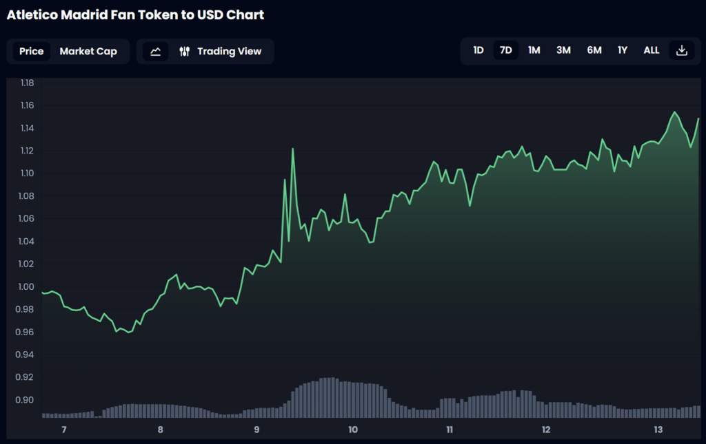 From a weekly low of $0.959, the valuation of the Atlético Madrid Fan Token ($ATM) climbed to a peak of $1.14 by April 13, as per price data from Socios.com, marking growth of 19.9%.