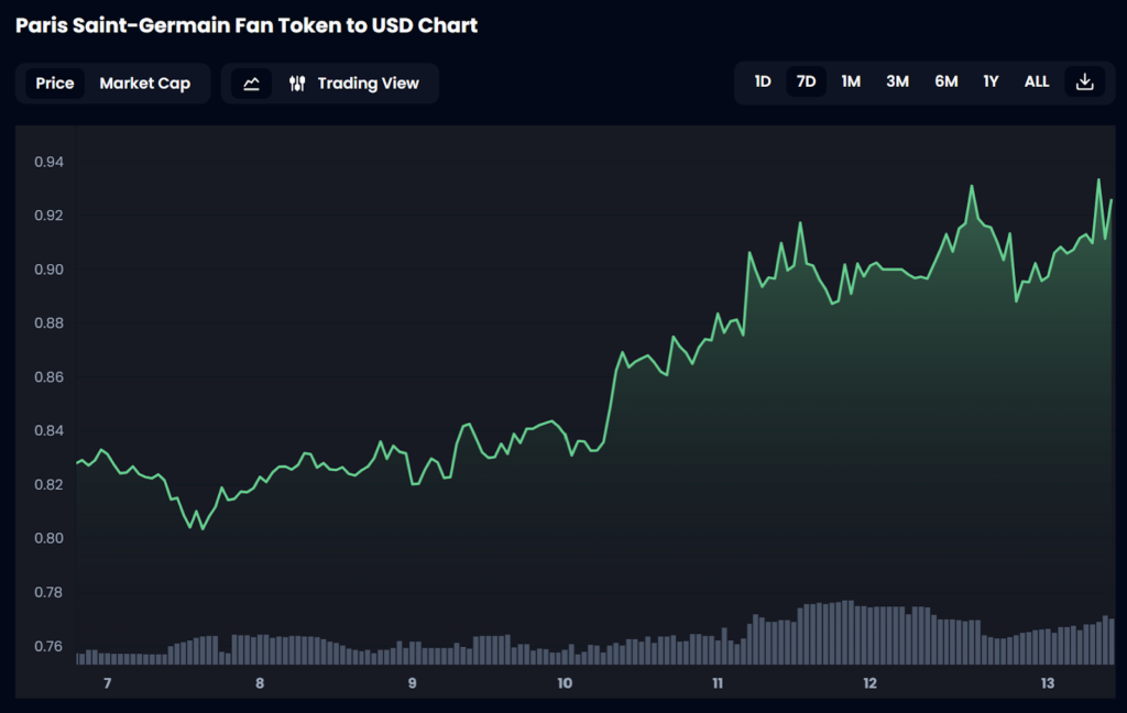 From a weekly low of $0.803, the value of the Paris Saint-Germain Fan Token ($PSG) climbed to a peak of $0.933 by April 13, as per price data from Socios.com.
