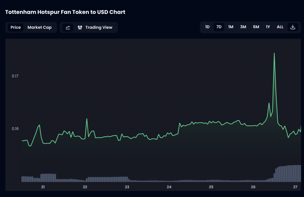 The morning after Spurs’ narrow 1-0 victory over bottom-placed Wolves, the value of the Tottenham Hotspur Fan Token™ ($SPURS) began to climb, its intraday gains reaching 8.6% by early afternoon on the back of soaring trade volumes.