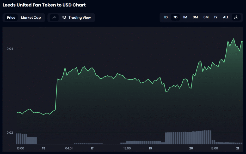 From a weekly low of $0.03 on April 13, the spot price of the Leeds United Fan Token ($LUFC) increased to $0.041 over the course of seven days, amounting to 36% growth.