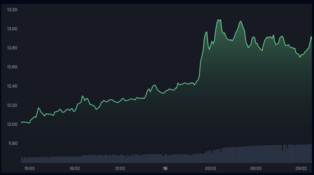 By time of publication, the token price had fallen back to a valuation of $12.92, leaving the token on 7.4% growth for the day overall.