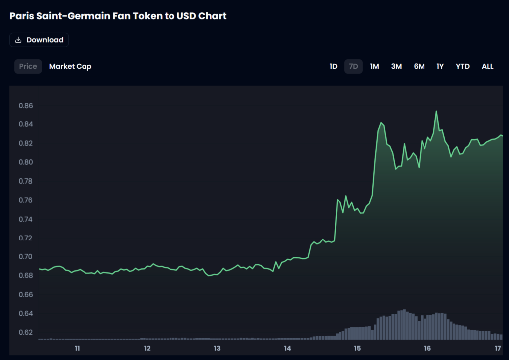 The spot price of the Paris Saint-Germain Fan Token ($PSG) soared to the tune of 25% over the past five days, in a clear example of how Fan Token trading logic is closely tied to team sentiment.