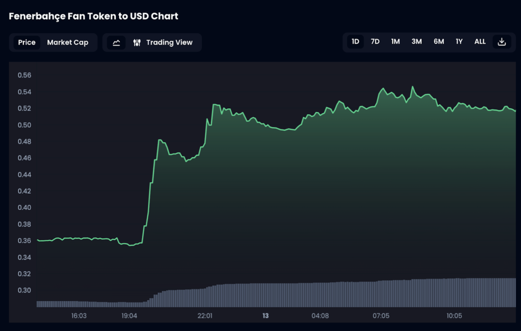 The Fenerbahçe Fan Token ($FB) is the best-performing SportFi asset over the last 24 hours, its value having rocketed 43% per Socios.com.