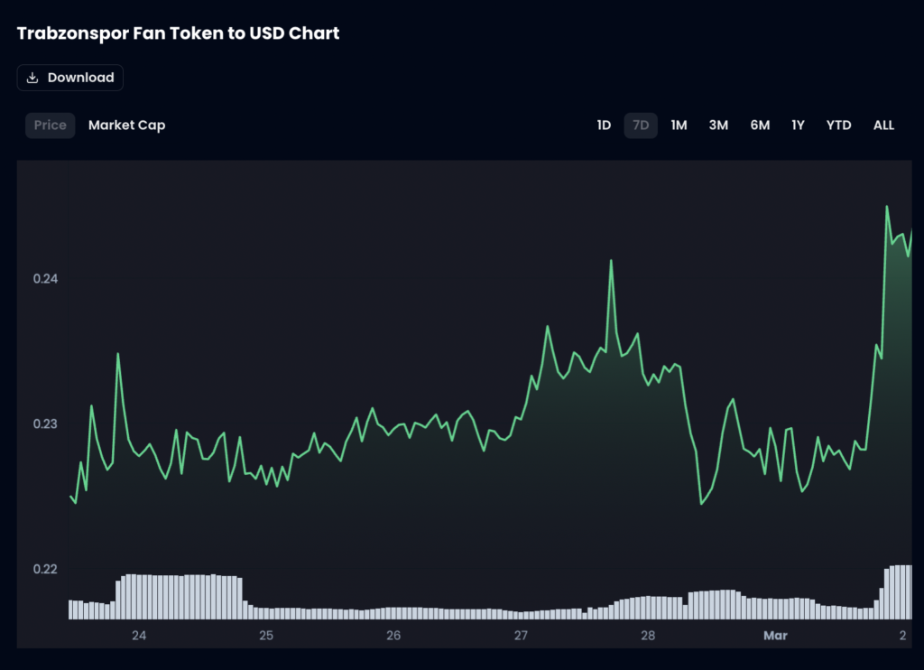 The Trabzonspor Fan Token ($TRA) is up 7.4% for the week, while the Beşiktaş Fan Token ($BJK) has climbed 6.9% over the same timeframe.