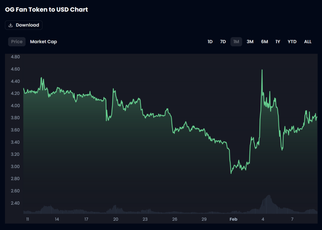 The $OG Fan Token has been on the rise since the start of February, recording a 34% price increase since Jan. 31. The price surge was driven by a peak of $67 million in daily trade volume per CoinMarketCap, which is the highest daily changeover recorded in five months.